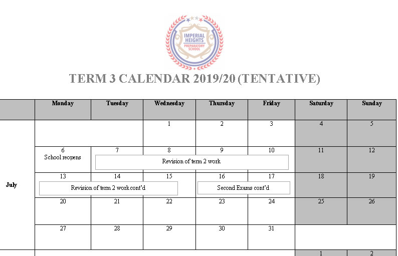 Imperial Heights Preparatory School proposes the Term 3 Calendar 2019/2020 ahead of tentative opening of school during this COVID19 pandemic lockdown.